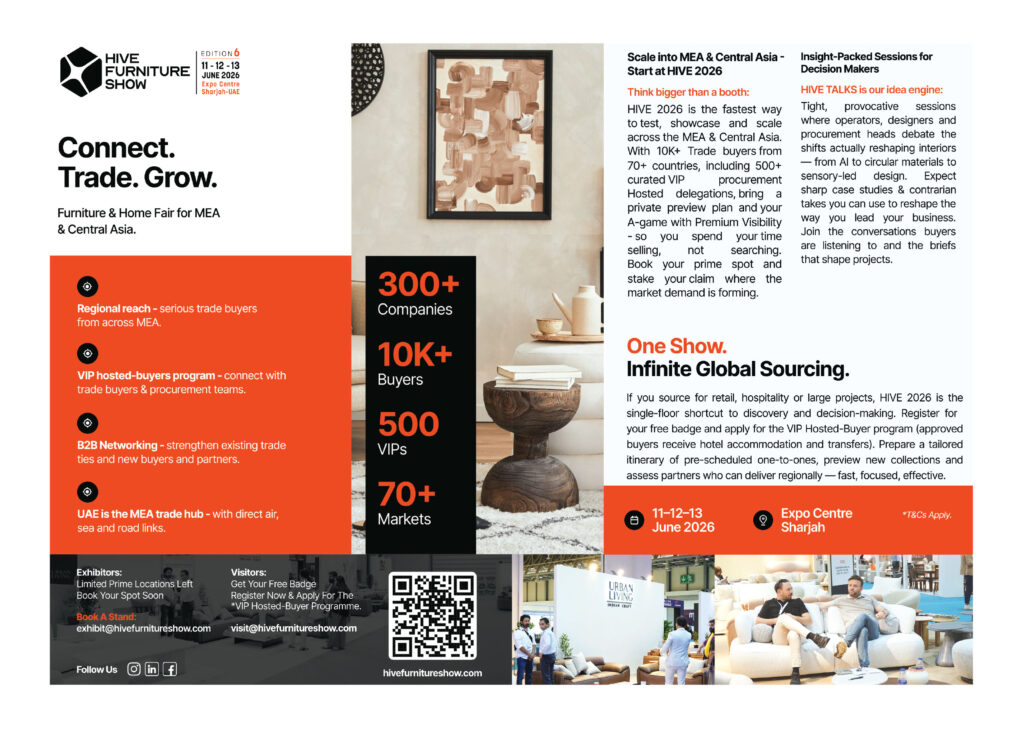 HIVE Furniture Show adminfurniture2026-02-09T10:25:59+08:00 Date : 11st – 13rd June, 2026 Venue : Expo Centre Sharjah, Sharjah, UAE Website : www.hivefurnitureshow.com Share this post Facebook Twitter LinkedIn Google + Email