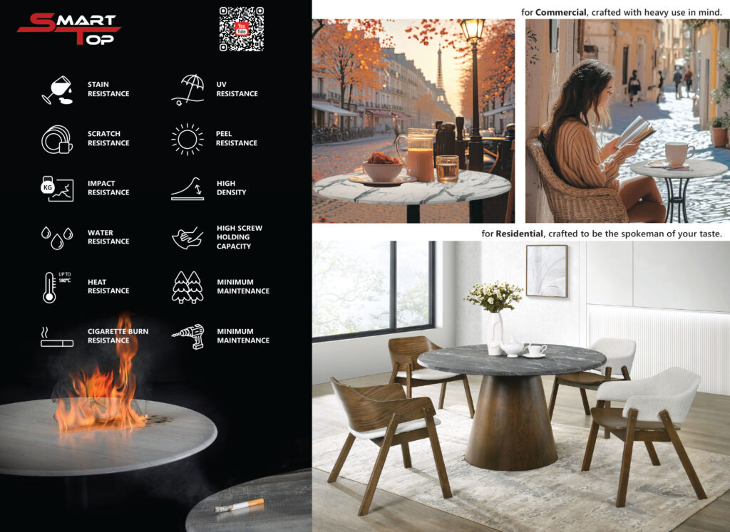 Smart Top™ is the world’s first and only manufacturer that produces Supermatte and Rough finish molded table top. Contact us now to catch on this innovative Smart Top™ concept.