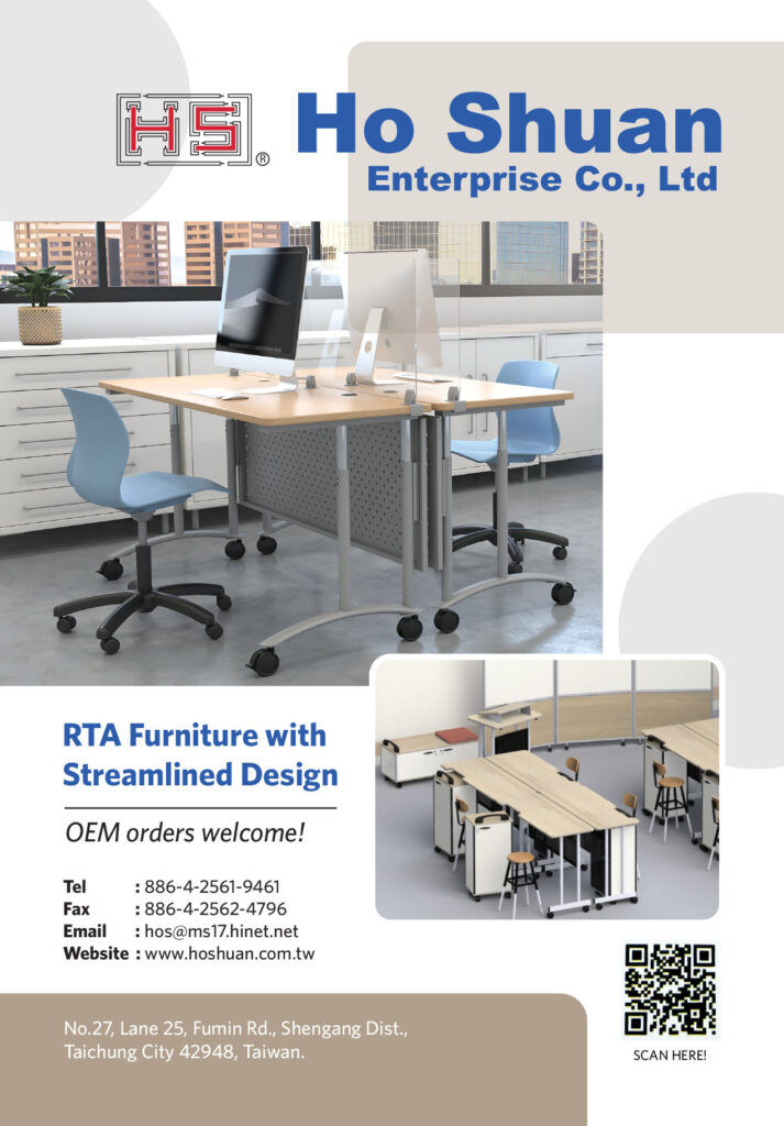 Currently, aside from ODM and OEM orders, Ho Shuan has designed folding tables, furniture for laboratory use, mobile cabinet trolleys to fit 3D printing machines and accessories, student desks, children’s’ furniture, RTA furniture with streamlined designs, and more.