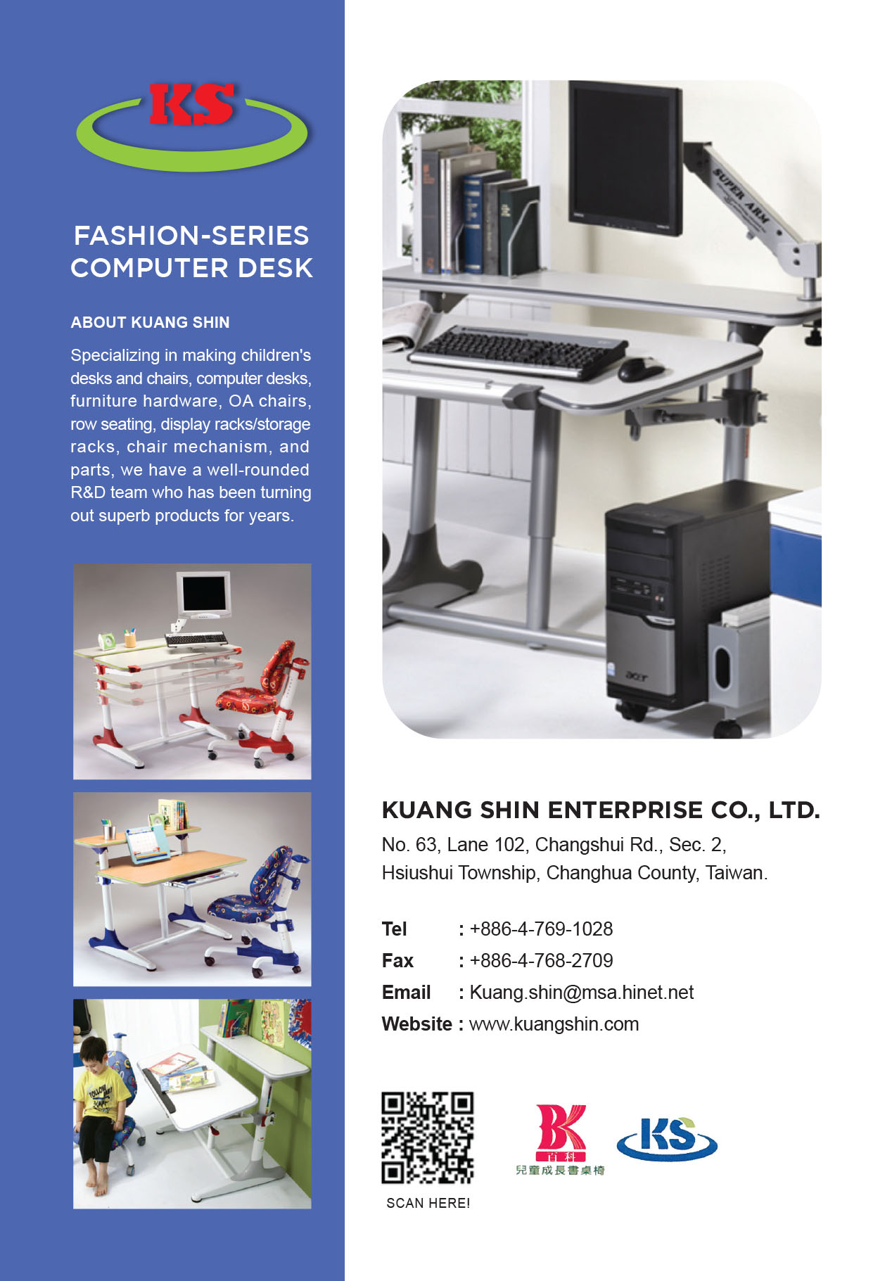 Specializing in making children’s desks and chairs, computer desks, furniture hardware, OA chairs, row seating, display racks/storage racks, chair mechanism, and parts, we have a well-rounded R&D team who has been turning out superb products for years. Guaranteeing prompt delivery, we welcome ODM orders.